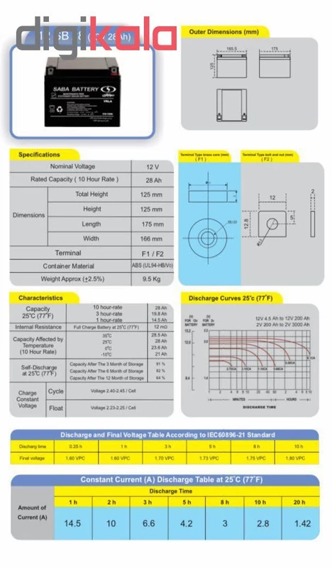 شرکت مهندسی پرنیان سازه اسپادانا(مپسا)، شرکتی دانش بنیان و فعال در حوزه انرژی تجدید پذیر است. این شرکت با هدف پایه گذاری نگاهی نو به حوزه انرژی در سطح ملی و منطقه ای و با بهره گیری از بهترین و کارآمدترین متخصصان و نخبگان این حوزه تا کنون پروژه های متعددی را در زمینه مطالعات فنی اقتصادی, امکان سنجی پروژه ها, امور پیمانکاری و مشاوره و تامین تجهیزات در حوزه انرژی خورشیدی را به اتمام رسانده است. مشخصات فنی محصول: ** مشخصات ** وزن: 9500 گرم سایر مشخصات: مناسب برای : آسانسور،ATM,UPS، سیستم های خورشیدی دوربین های مدار بسته درب پارکینگ شبکه های کامپیوتری دزدگیر ولتاژ نامی: 12 ولت حداکثر جریان شارژ: 28 آمپر