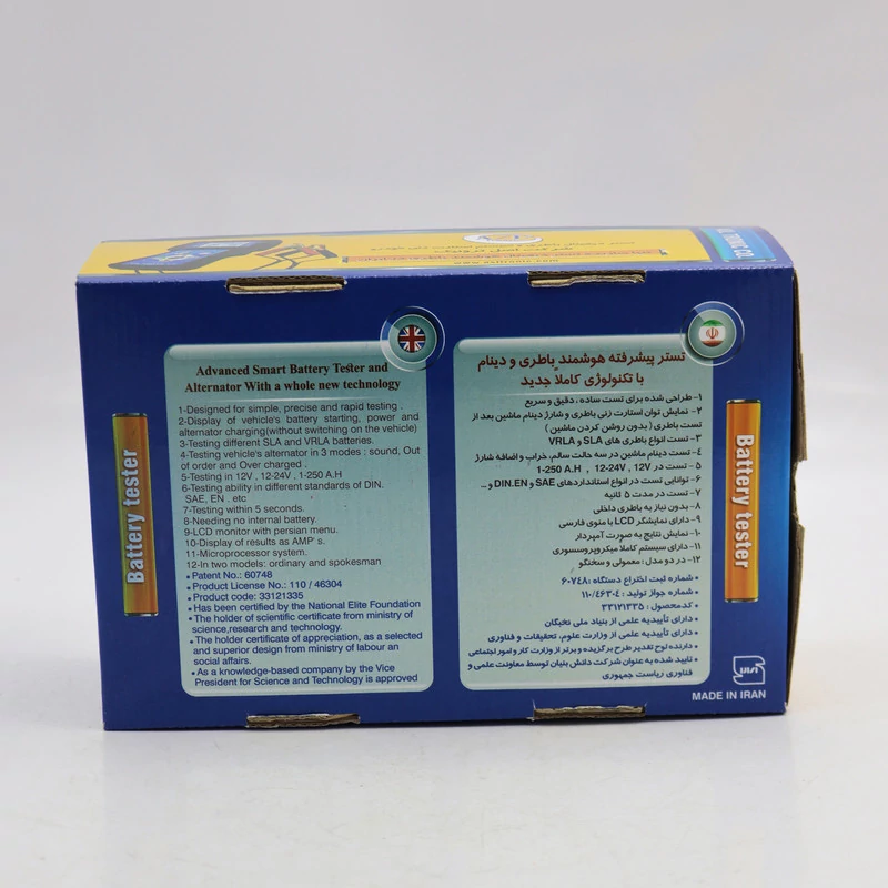 دستگاه دارای منوی فارسی طراحی شده برای تست ساده ، دقیق و سریع نمایش توان استارت زنی باطری و شارژ دینام خودرو بعد از تست باطری(بدون روشن کردن خودرو) تست انواع باطری های SLA , VRLA تست دینام خودرو در سه حالت سالم، خراب ، و اضافه شارژ توانایی تست در انواع استانداردهای SAE و DIN.EN و ... تست در مدت 5 ثانیه بدون نیاز به باطری داخلی ( تغذیه از باطری خودرو ) دارای نمایشگر LCD با منوی فارسی نمایش نتایج به صورت دیجیتال با تست باتری 12 و 24 ولت (خودرو سواری و سنگین) ساعت