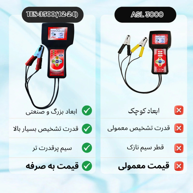 دستگاه تستر باتری و دینام مدل TES-3500(12-24) توانایی تست کلیه باتری های موتورسیکلت، یوپی اس و ماشین های سبک و سنگین را دارا است و همچنین می تواند دینام خودروهای 12 ولت و 24 ولت را چک کند و وضعیت دینام را به صورت گرافیکی و عددی با دقت بسیار بالا نمایش دهد. از جمله ویژگی های این دستگاه می توان به داشتن منوی فارسی، تست دقیق و ساده، نمایش وضعیت باتری و شارژ دینام، تست انواع باتری اشاره کرد. مشخصات فنی محصول: ** مشخصات ** نوع تجهیزات تعمیرگاهی: سایر تجهیزات تعمیرگاهی ابعاد: 24x9x14 سانتیمتر وزن: 1 کیلوگرم ویژگیهای تجهیزات تعمیرگاهی: کاربرد صنعتی