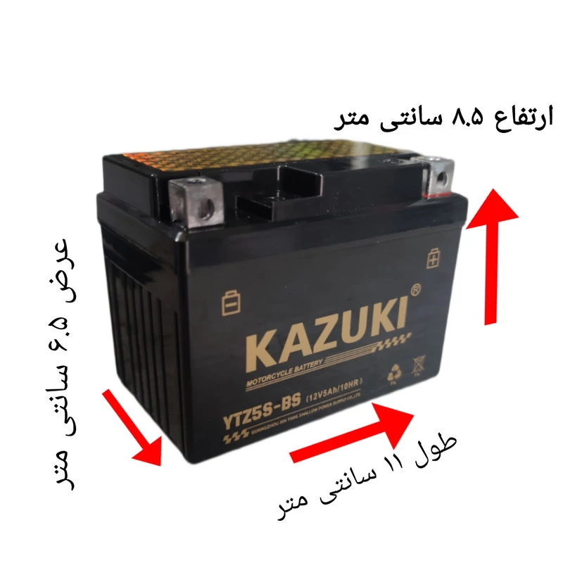 ابعاد باتری موتورسیکلت 12 ولت 5 آمپر کوتاه خارجی کازوکی مناسب باطری موتور ویو ، طرح ویو و پاکشتی طول 11 سانتی متر و عرض 6.5 سانتی متر و ارتفاع 8.5 مانند: ویو ، طرح ویو ، هوندا بدون استارت