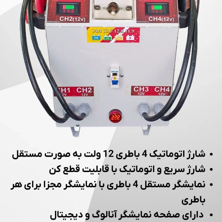 -شارژر اتوماتیک 4 باطری 12 ولت به صورت مستقل -شارژ سریع و دارای قطع کن اتوماتیک -دارای نمایشگر دیجیتال و آنالوگ - نمایشگر مستقل برای هر باطری با بصورت جداگانه